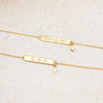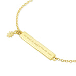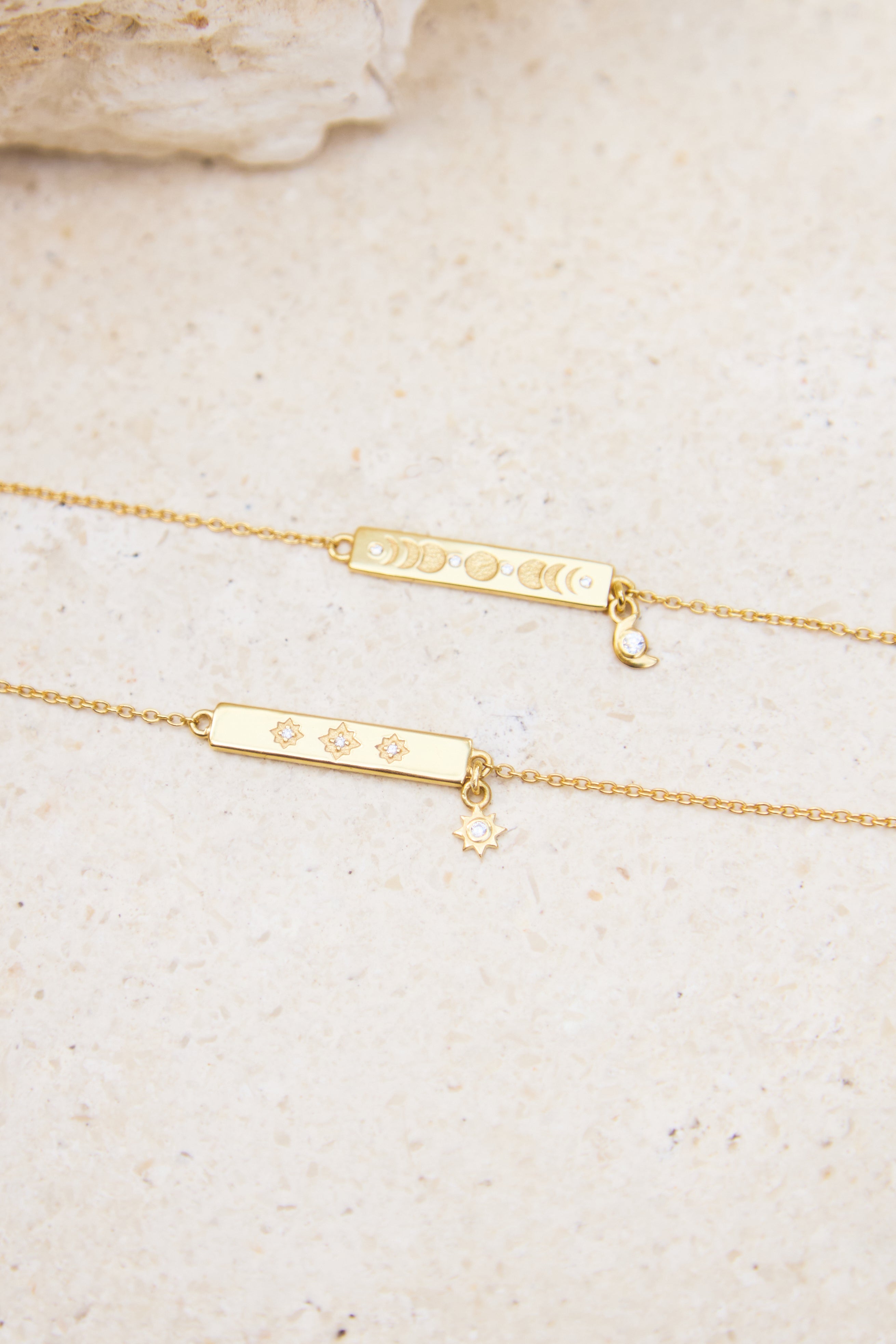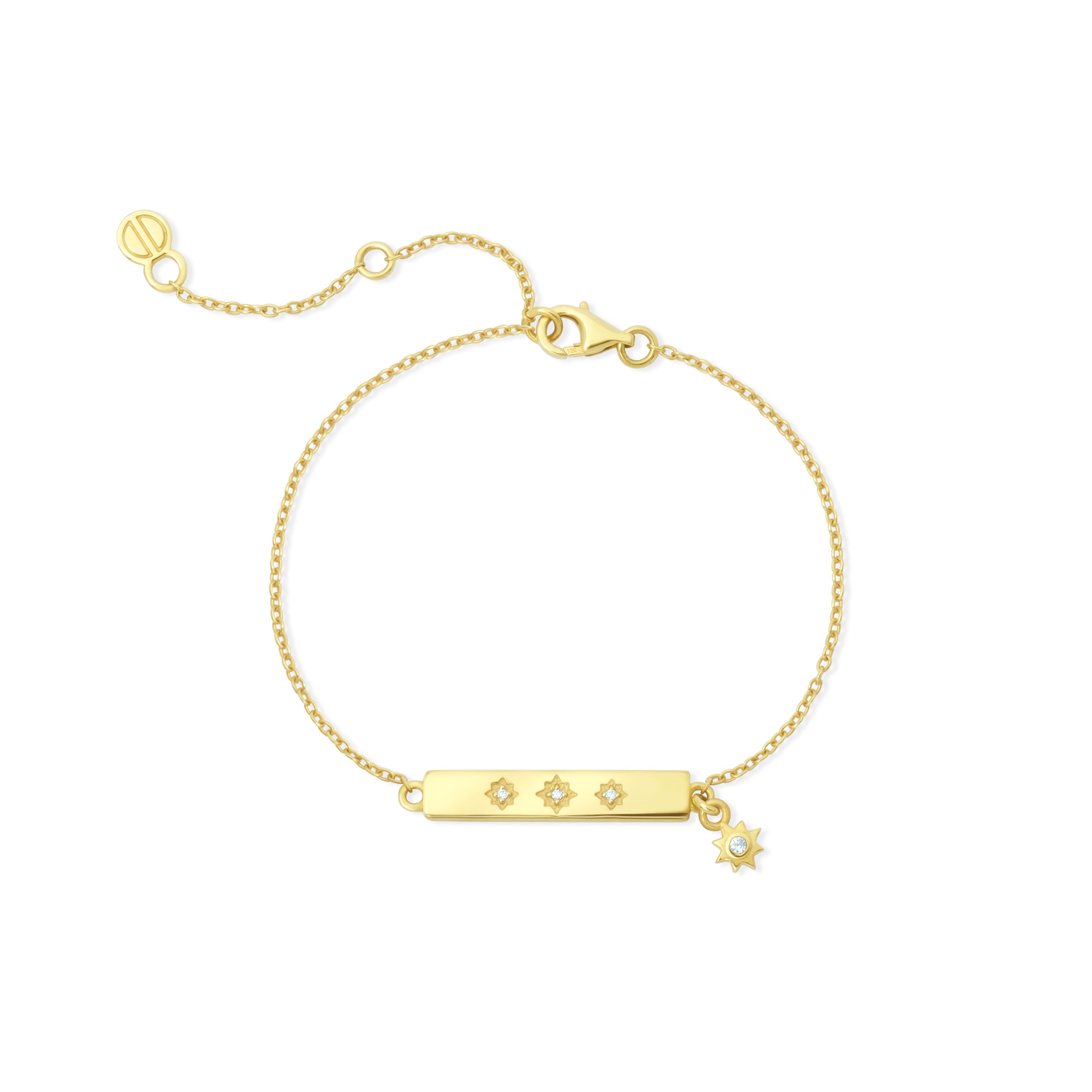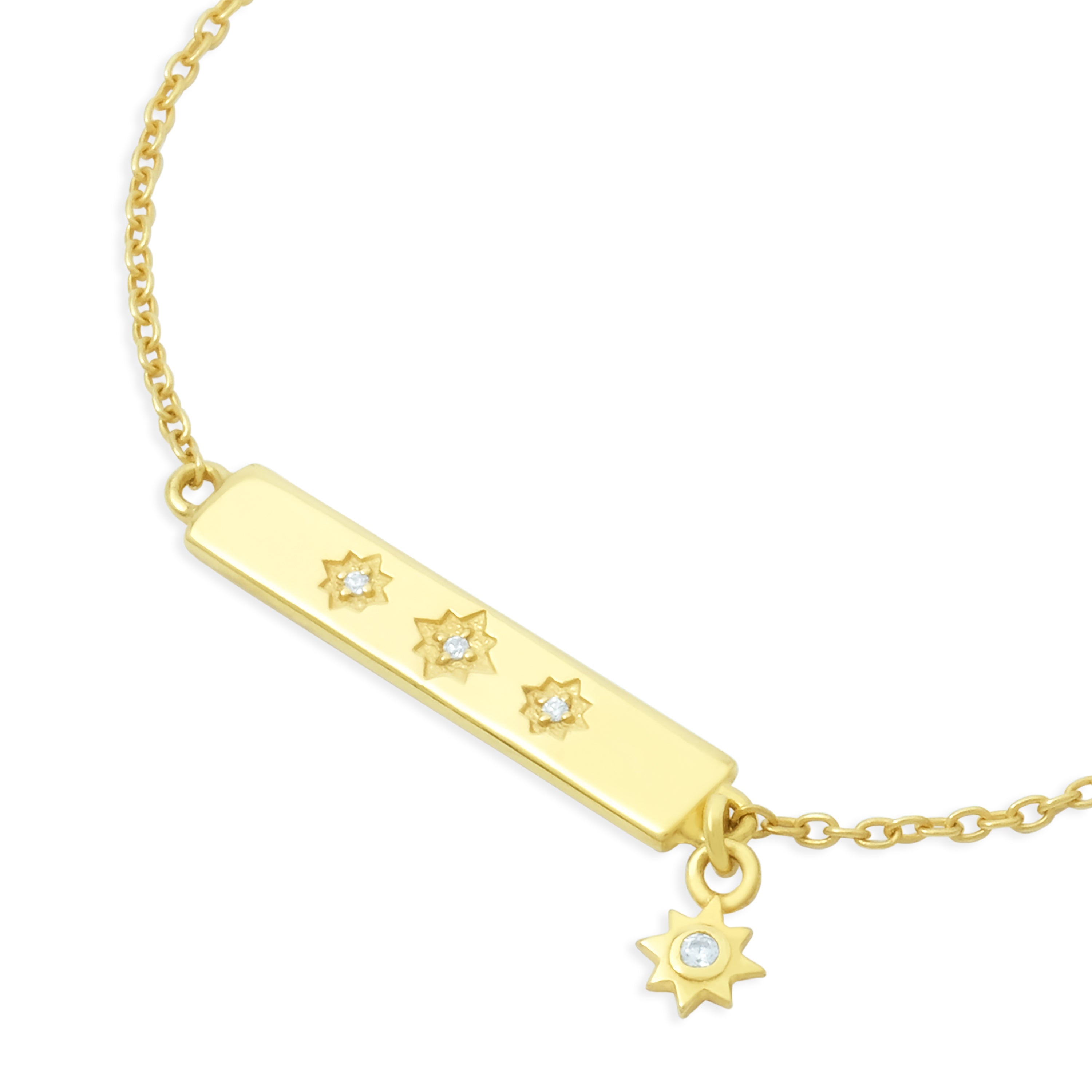 Gold vermeil bracelet with a three-star cutout bar, accented by white zircon. A hidden engraved mantra rests on the reverse, finished with a delicate mini star charm.
