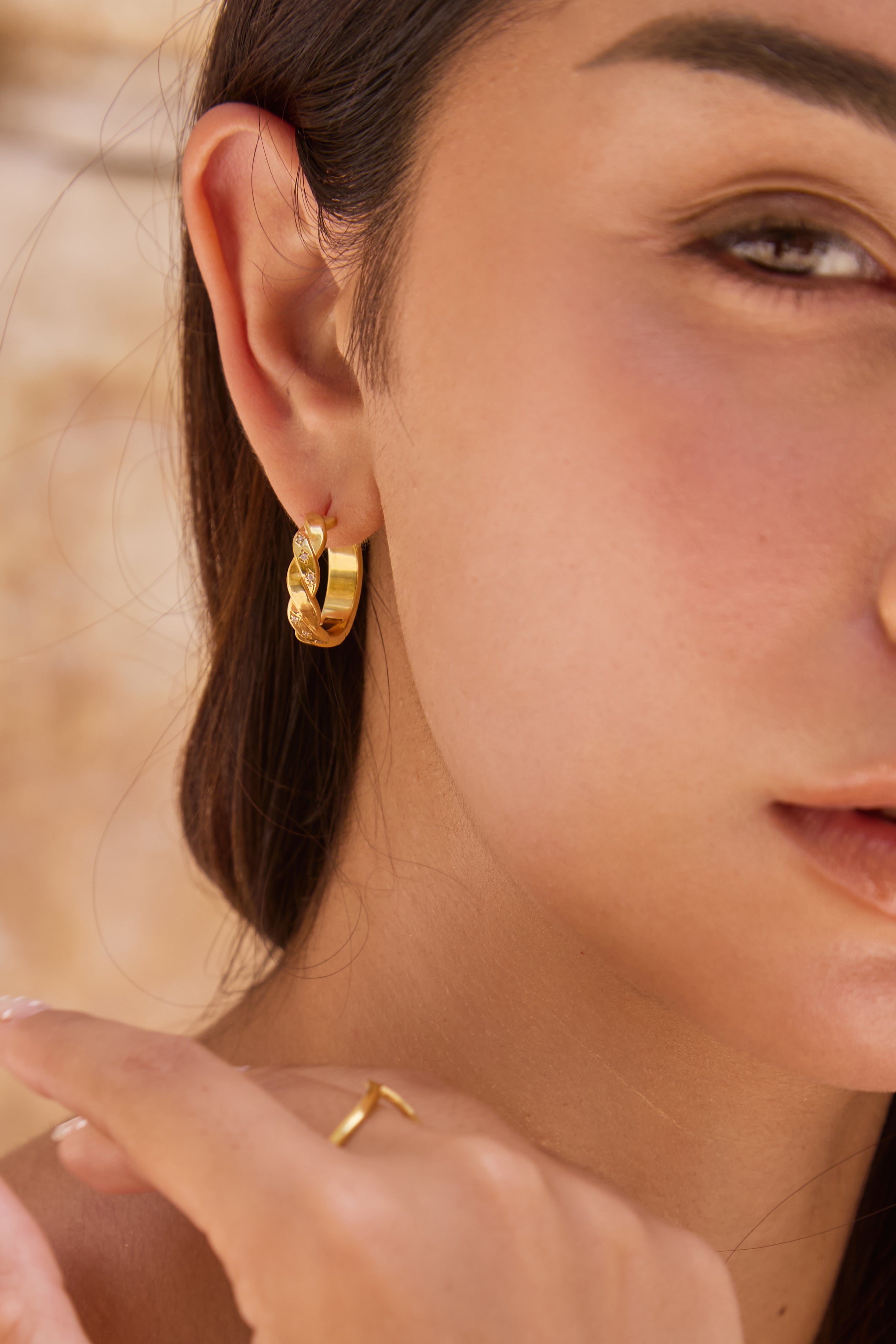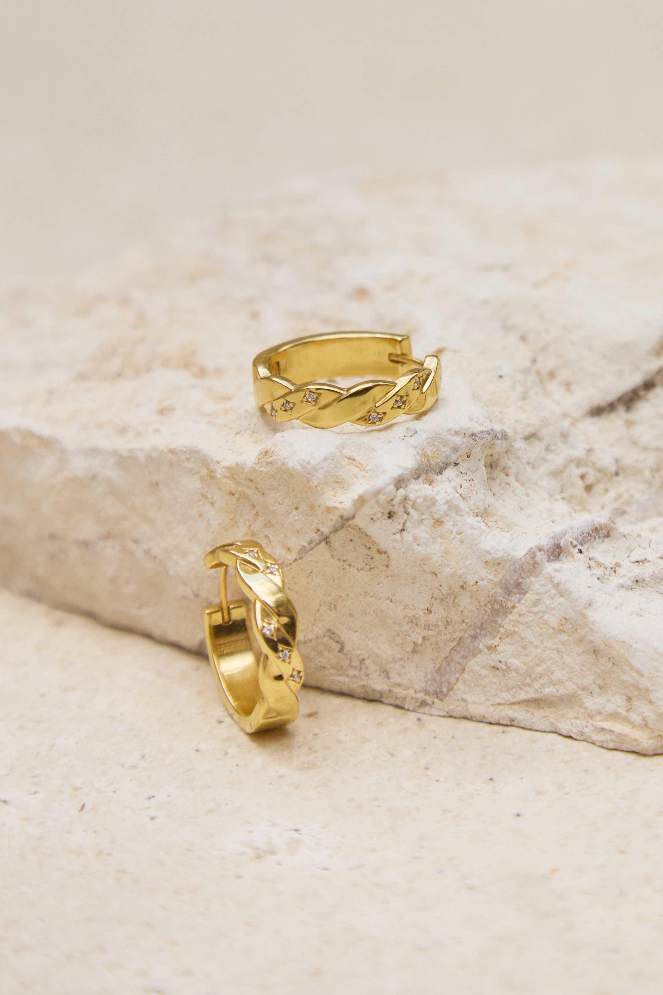 Gold vermeil huggie hoops with twisted star-set detailing and white zircon stones.