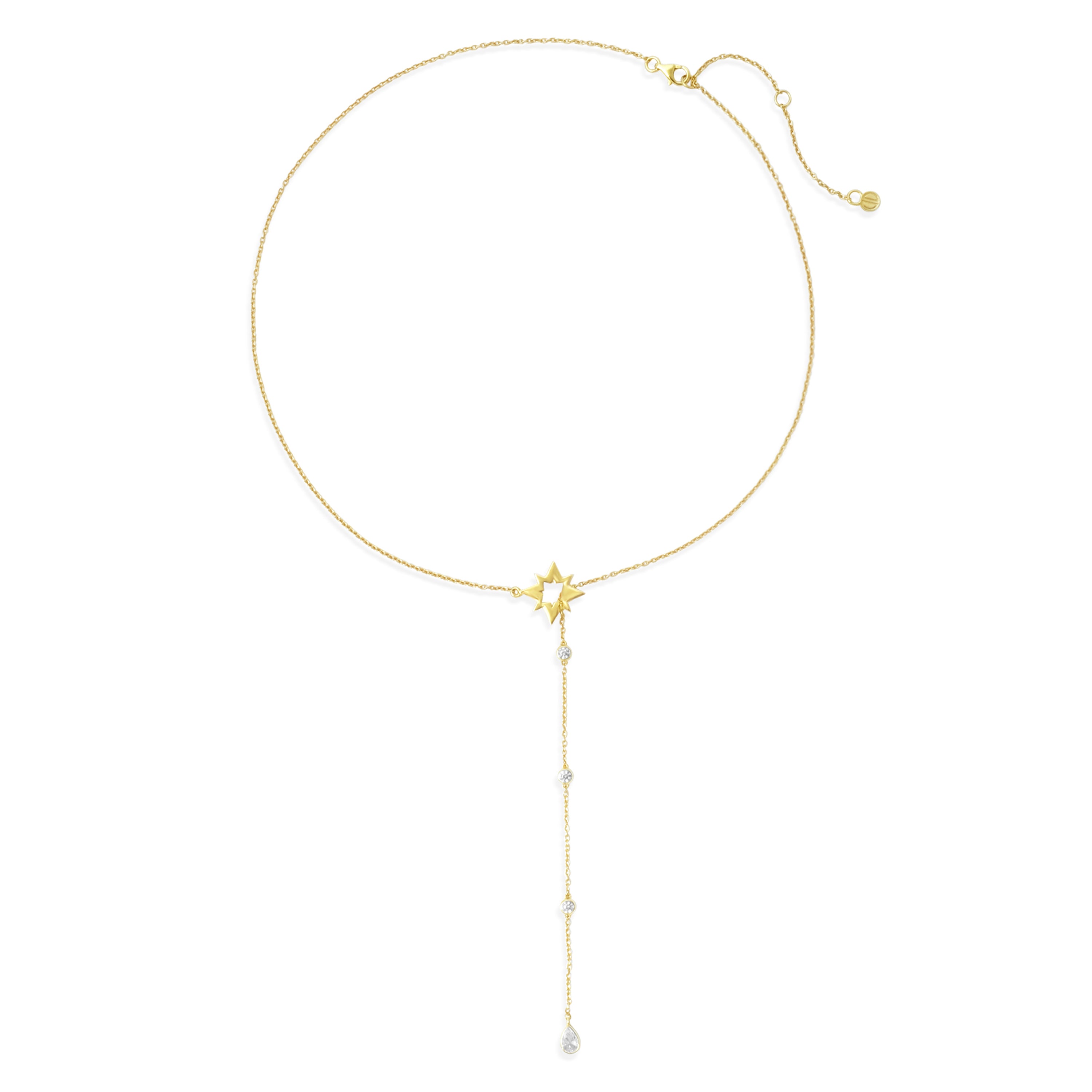 Gold vermeil lariat necklace with a white zircon–studded chain, a single zircon drop and a signature eight-point star.