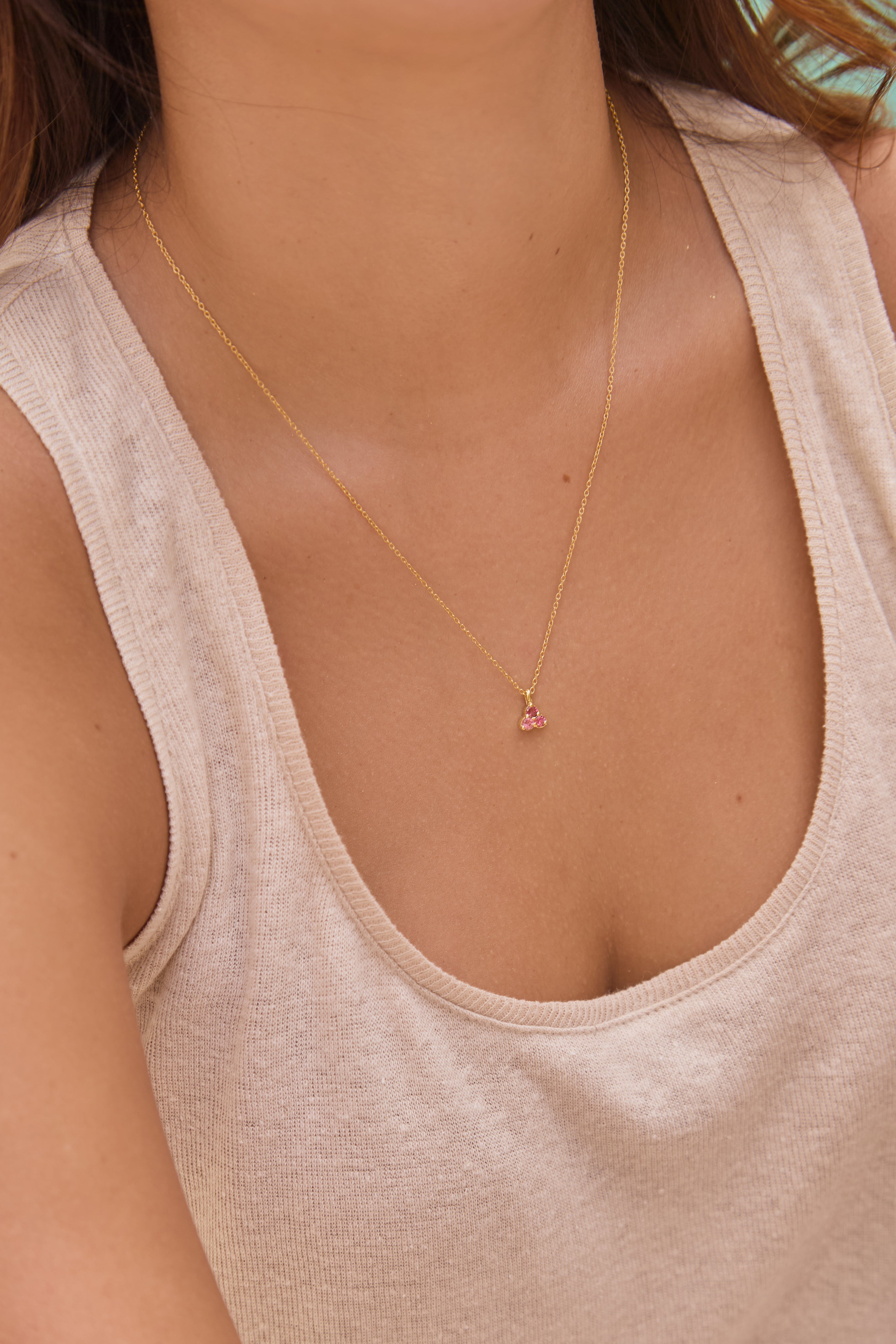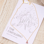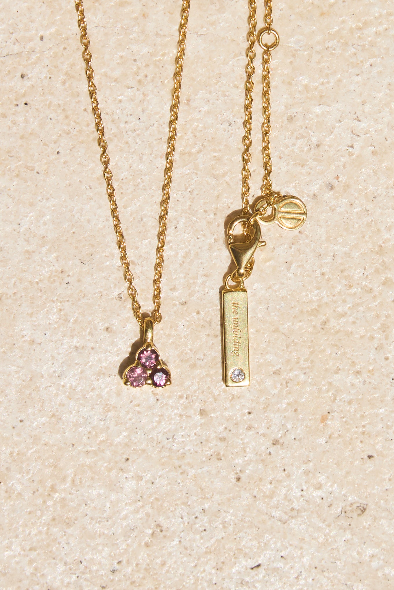 Part of the Dreamer Archetypes collection. A gold vermeil necklace featuring three Pink Tourmaline stones, paired with a small decorative tag engraved with the archetype name and set with a Zircon stone.